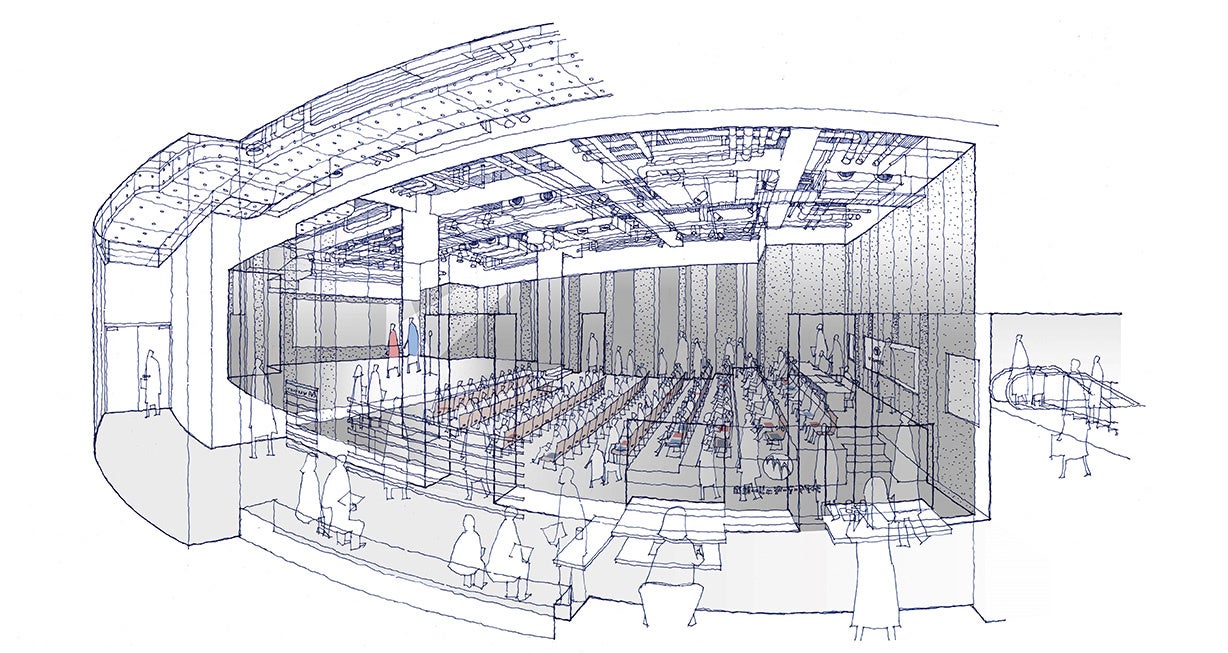 舞台と客席に一体感を感じられるような大半を黒で統一したブラックボックス空間に、高精細な大型LEDビジョンを設置。大迫力の映像と共に音響や機材のご紹介をさせていただきます。