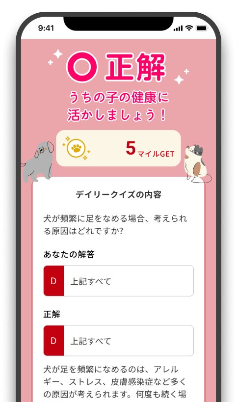 アプリに登録したペットの種類に基づき、それぞれの特性や健康に関するクイズが毎日1問出題されます。楽しみながら学び、自然とペットの健康に関する理解を深めることができます。