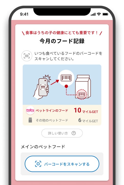 普段食べているフードのバーコードをスマートフォンのカメラで読み取って登録することができます。登録したフードは記録され、一覧で見返すことができます。フードの種類や登録数によってマイルが付与されます。