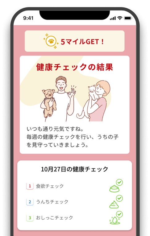 また、定期的な記録を通して、ペットの成長や健康状態の変化を「見える化」することで、健康寿命に貢献します。日々の健康状態の記録で、その都度マイルが付与される仕組みになっています。