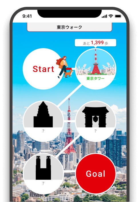 歩数に応じて日本全国の観光名所を巡る体験ができるウォーキング機能です。日々のウォーキングが日本一周の旅のように感じられ、健康維持のモチベーション向上に役立ちます。 6,000歩毎にマイルが付与されます。