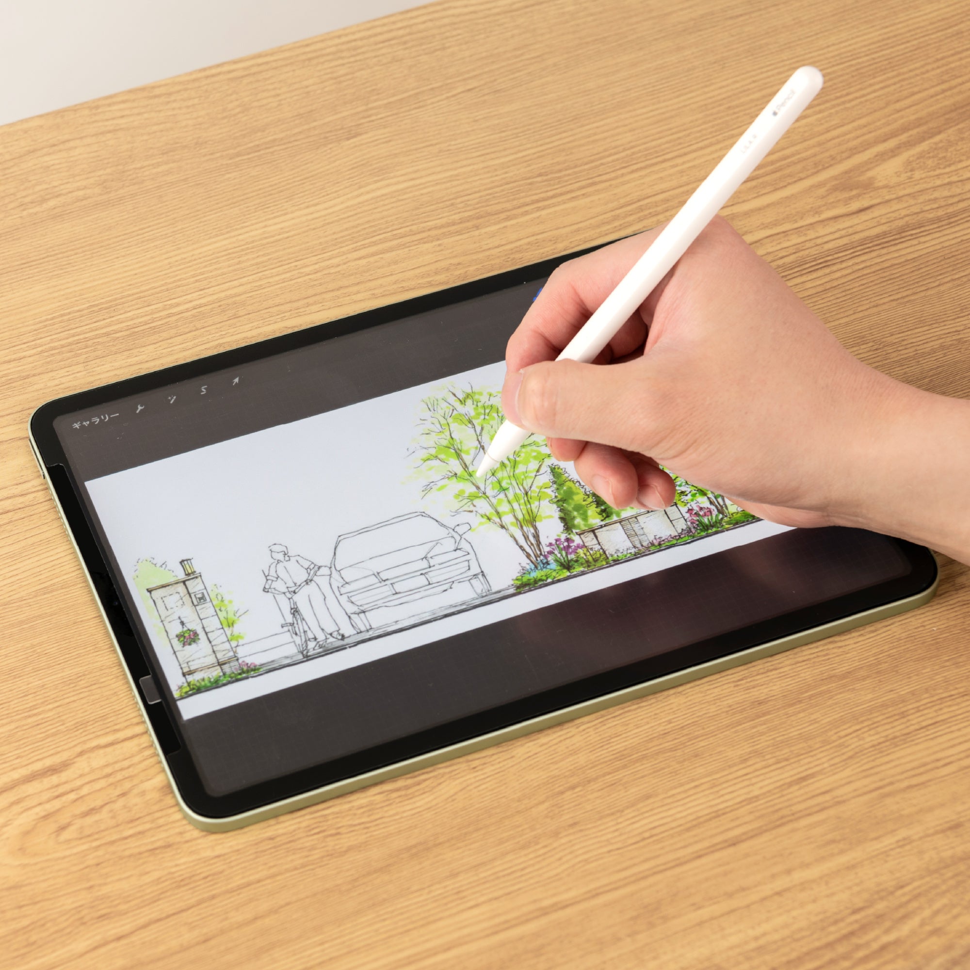 「着脱式ペーパータッチフィルム」は簡単に着脱できるiPadシリーズ用のペーパーライクフィルムです。表面に特殊加工がされているため、スタイラスペンで描画する際にほどよい摩擦が生まれ紙に描くような書き心地を得ることができます。ケント紙に描くようにスタイラスペンを使えるためイラスト制作などでiPadを活用するクリエイターに最適です。
