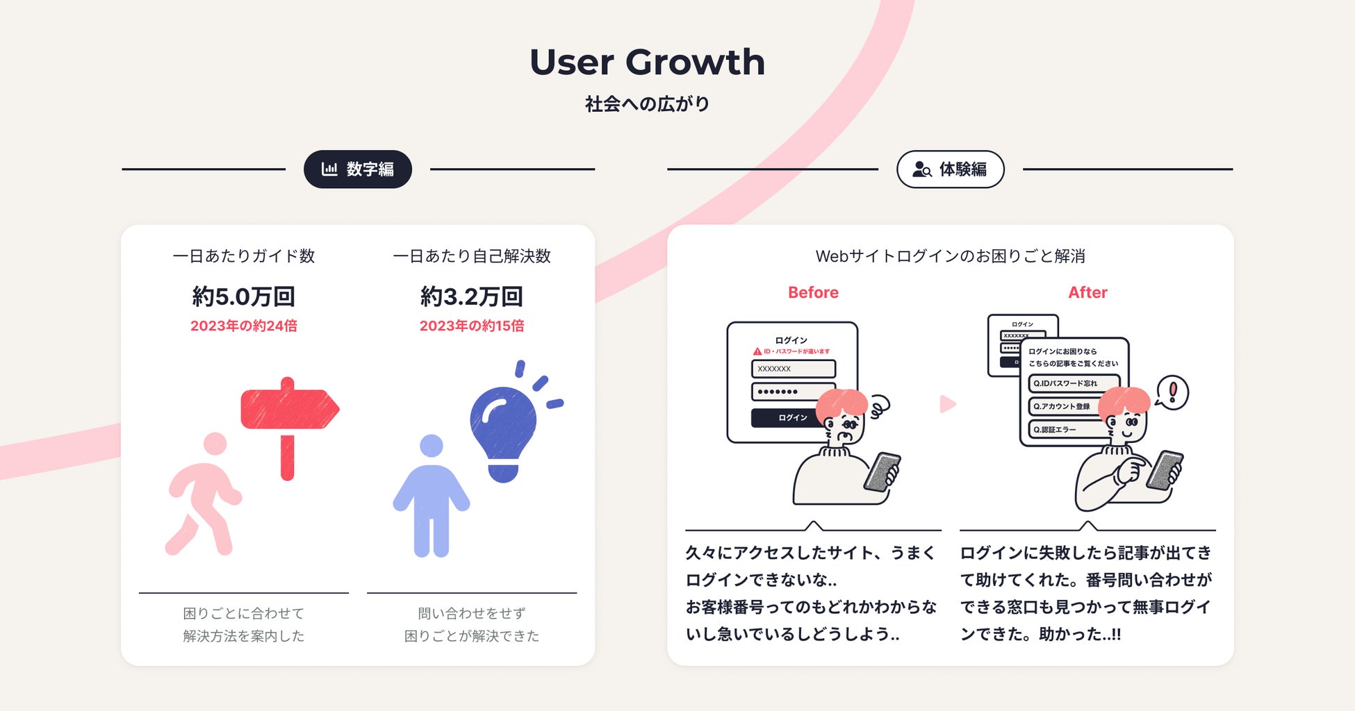 今回のインフォグラフィックスでは3年間で育まれた「広がり」をプロダクトが解析するデータ全体で見たときの統計と、そのなかで起きている一人ひとりの顧客体験の具体的なストーリー、それぞれの観点を視覚的に把握することができるように制作しています。