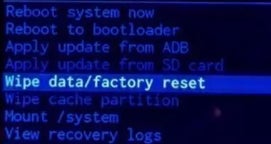 Step3:リカバリーモードが起動したら音量下ボタンを押して「Wipe data/factory reset」に移動し、電源ボタンを押します。