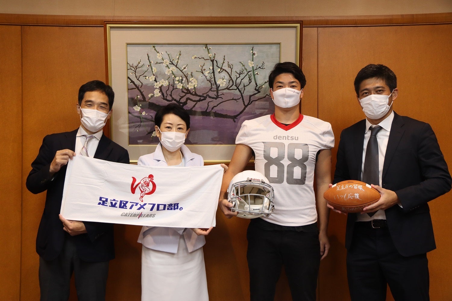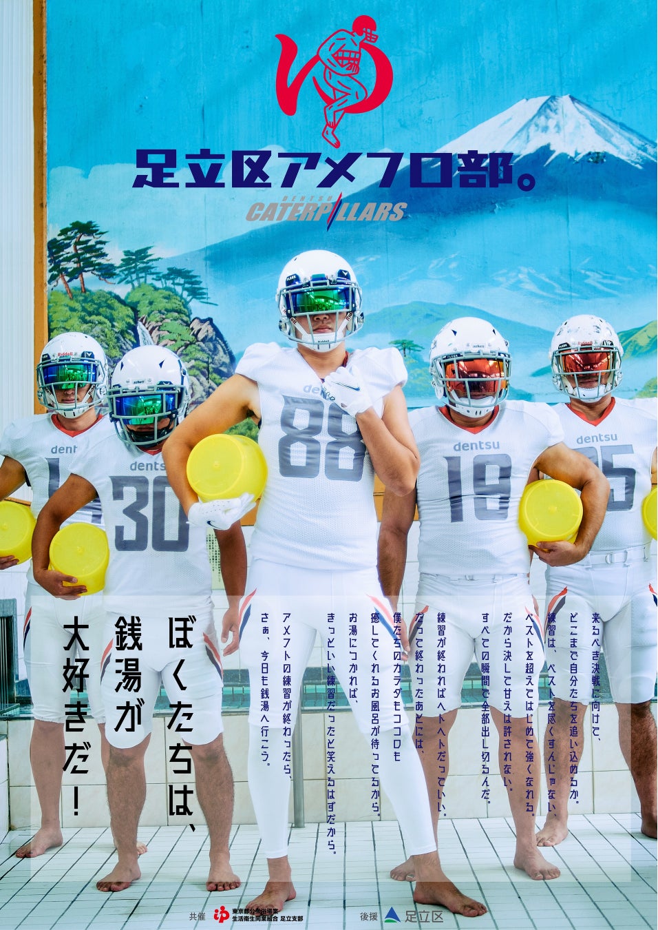 足立区で練習を行っている”電通キャタピラーズ”。「練習を行っている足立区の魅力を発信したい」との思いから、足立区浴場組合と連携し”足立区アメフロ部。”を発足。足立区もこの取り組みを後援し、プロモーションビデオ・ポスターの制作に至りました。今後も、清掃活動への参加や小学校に向けたフラッグフットボール教室の実施など、様々な地域貢献活動が予定されています。