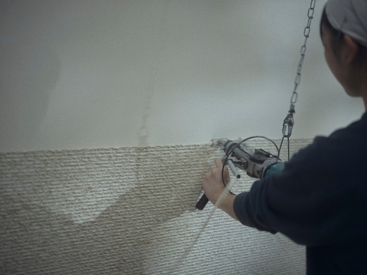 高品質な緞通の量産化を図った製法です。原寸大の製作図面を基布に転写し、フックガンという専用の工具で羊毛を打ち込み、刺繍のようにじゅうたんを織っていきます。職人が工具と一体になり、図面に対して正確な動作を行うと共に、常に一定の力で高密度に羊毛を打ち込んでいくには、修練による高い技術を要します。