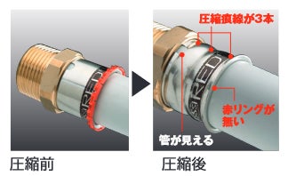 継手圧縮後は、外観(色)の変化を目視で確認しやすいため、水圧試験を実施する前に、圧縮締め忘れの発見が容易になります。