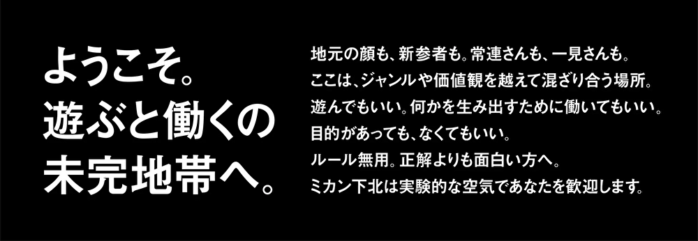 ミカン下北は「ようこそ。遊ぶと働くの未完地帯へ。」というプロジェクトコンセプトの下、下北沢の自由で雑多な空気の中で、多様な人々がジャンルや価値観を超えて混ざり合い、予想もつかない何かが生まれる場所を目指し、2022年3月に開業しました。施設名称である「ミカン下北」には、多様な文化が交差し、絶えず自由に編集され、変わり続ける、つまり“常に未完である”ことに下北沢の普遍的な魅力を見出し、未完ゆえに生まれる新たな実験や挑戦を促す想いが込められています。