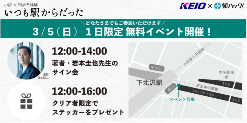 「いつも駅からだった」は、京王沿線を舞台にした短編小説シリーズで、小説家の岩井圭也氏が書き下ろした完全オリジナルストーリーの「小説×街歩き」体験型コンテンツです。京王沿線の駅や街、実在する商店街・店舗などの地域コンテンツを取り上げながら、「友情」や「家族の絆」等をテーマにした物語が描かれます。第1話は下北沢を舞台に、メジャーデビューを果たしたタイミングで、とあるSNSの投稿をきっかけに失踪してしまうバンドマンにまつわる物語です。