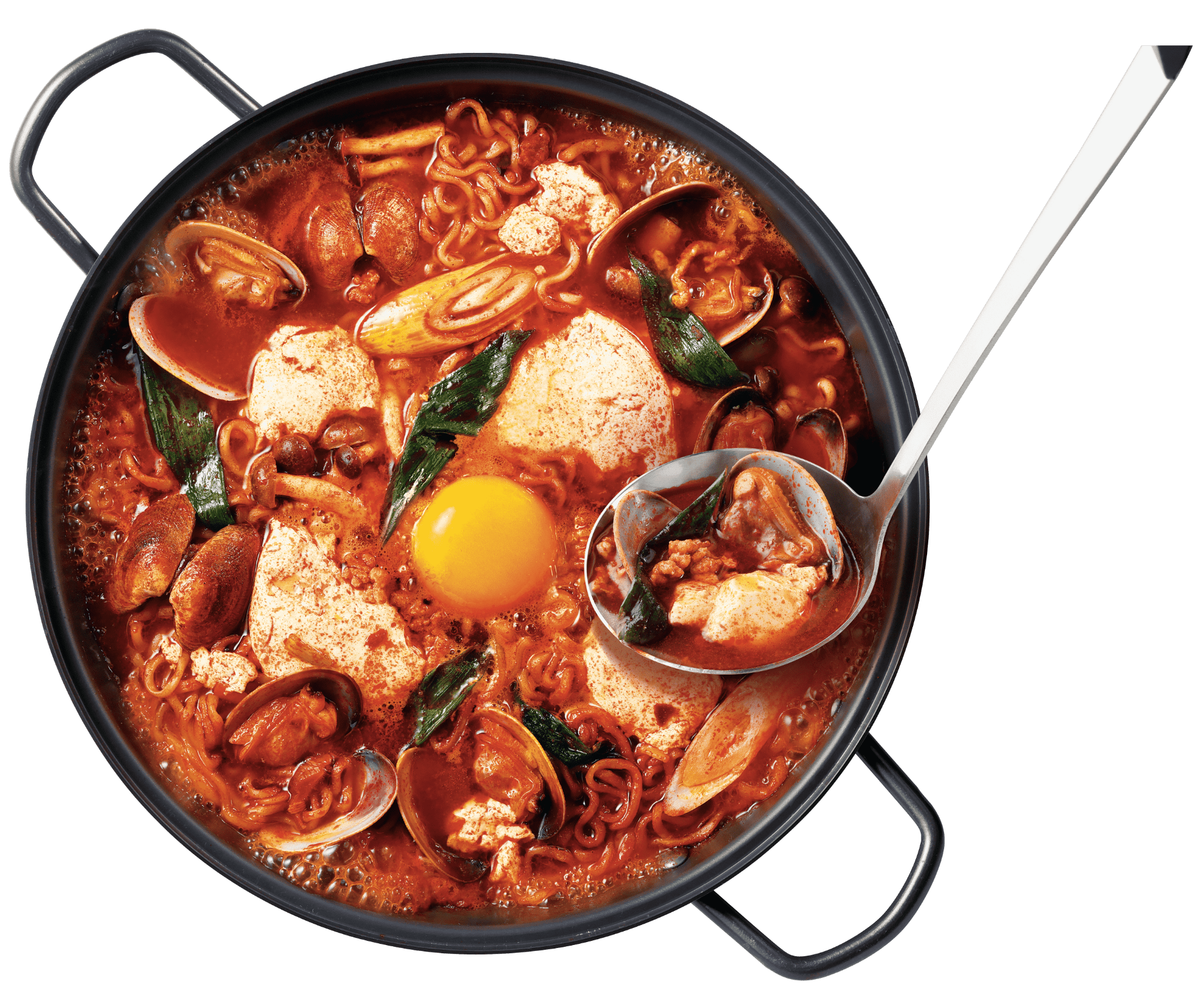 プデは韓国語で部隊、チゲは鍋の意味で軍隊で食べられていた事が由来となった料理。ニンニクがしっかり効いたパンチのあるスープとランチョンミートやソーセージなどにインスタント麺を加えたジャンクな味わいがやみつきに。辛ラーメンの旨味と辛味が効いた王道のチゲ料理です。