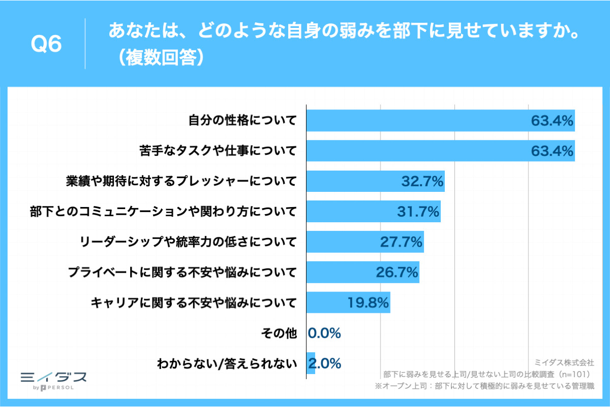 部下に見せている弱み、「自分の性格」や「苦手なタスクや仕事」など