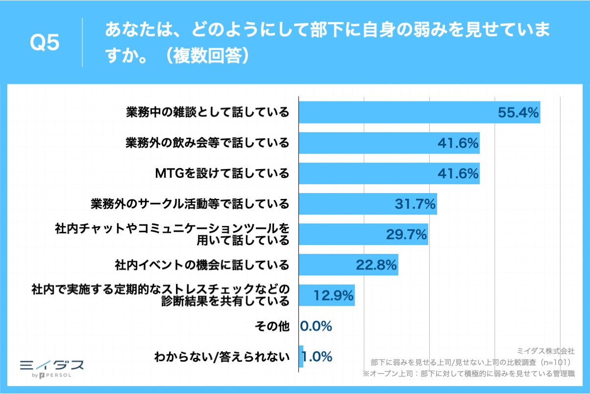 弱みの見せ方、「業務中の雑談として話している」が55.4%、「業務外の飲み会等で話している」が41.6%