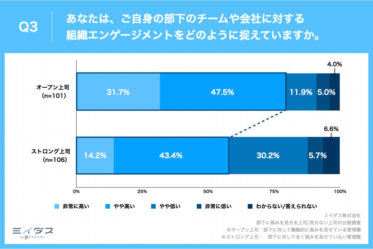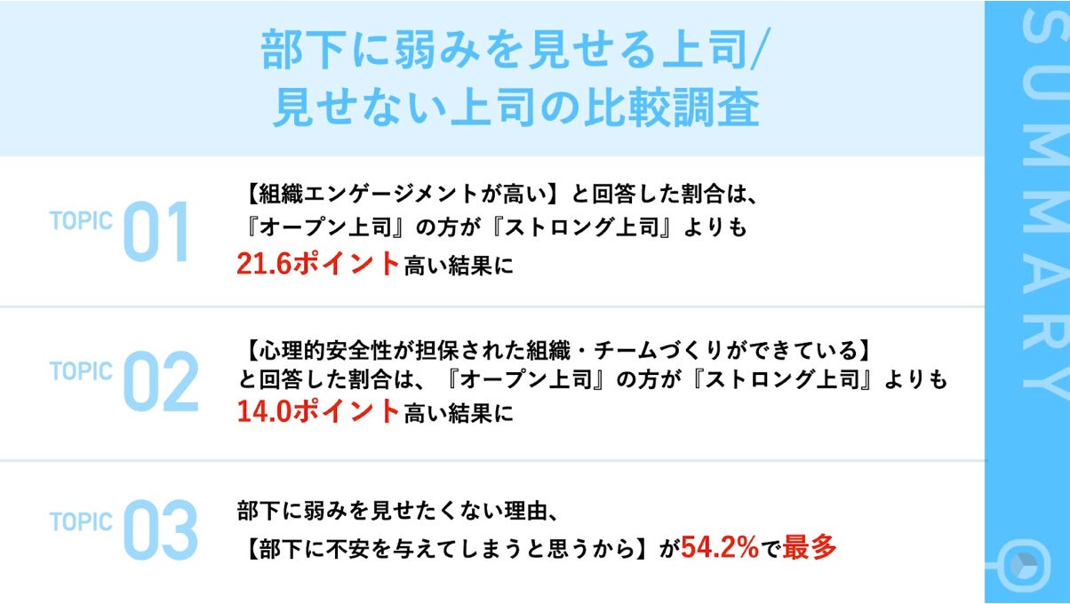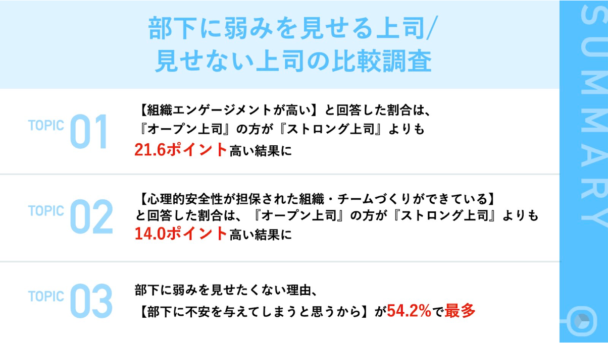 【後編:上司調査】上司は部下に「弱み」を見せるべき?比較調査の結果、『オープン上司』の方が「組織エンゲージメント」が高く「心理的安全性を意識したチーム作り」ができていることが明らかに!