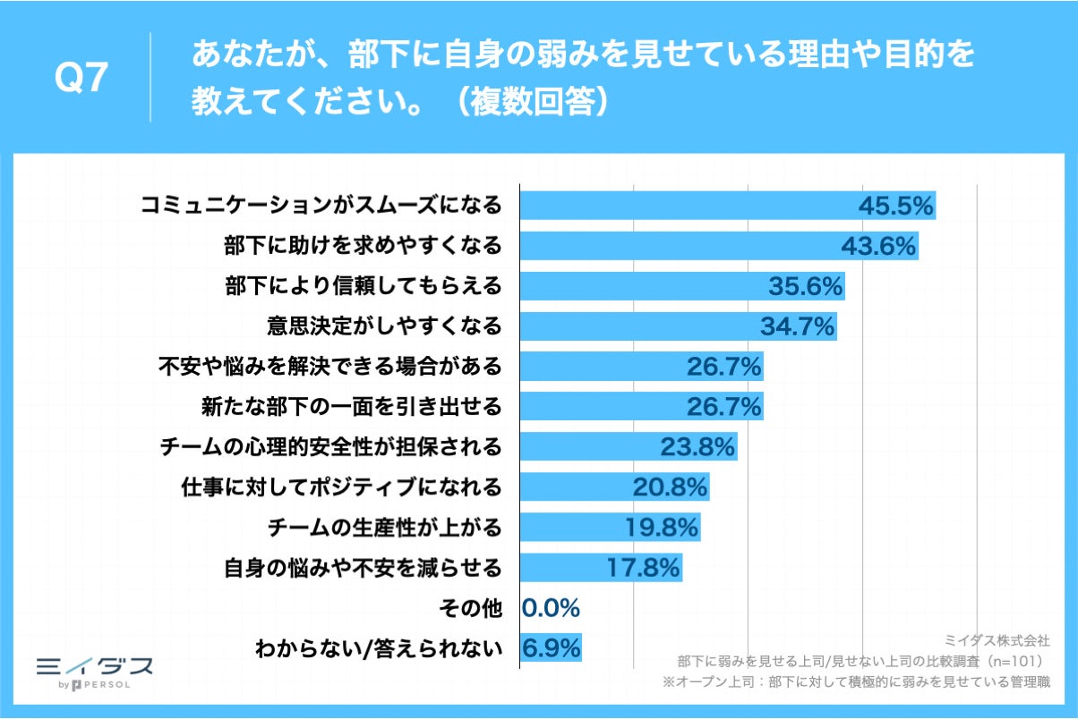 弱みを見せている理由や目的、「コミュニケーションがスムーズになる」や「部下に助けを求めやすくなる」など