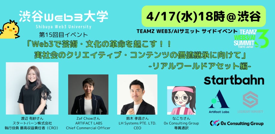 【参加無料】「Web3で芸術・文化革命を起こす!! すべてのクリエイティブ領域の価値の永続的な継続の実現に向けて」 -リアルワールドアセット編- 【渋谷Web3大学第15回目イベント】