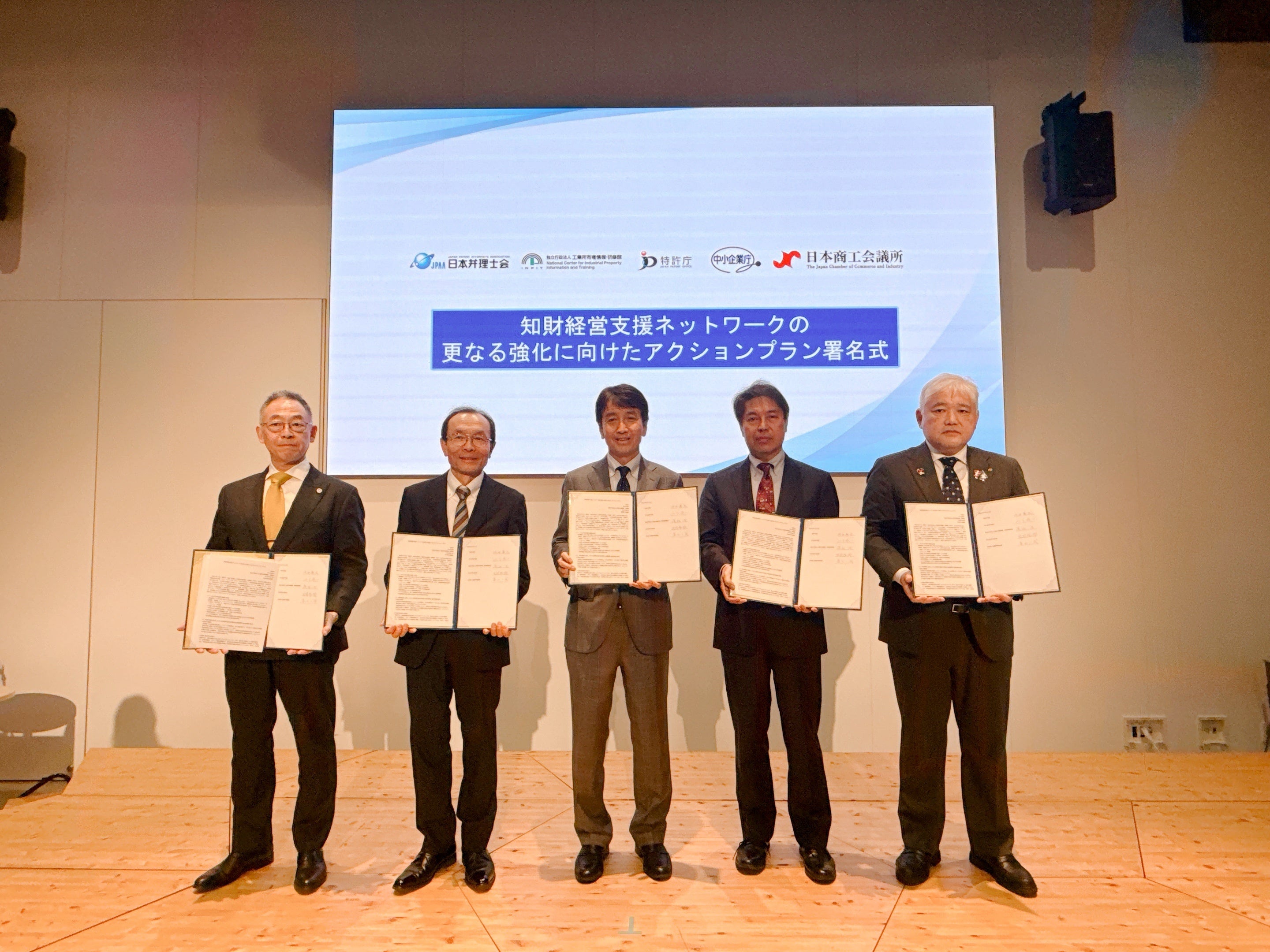 INPIT、特許庁、中小企業庁、日本弁理士会及び日本商工会議所は、5者で連携して構築している「知財経営支援ネットワーク」について、これまでの取組を継続しつつ、成果の全国への拡大や、見えてきた新たな課題への対応、各機関における支援策等の相乗効果の向上等を目的として、同ネットワークの更なる強化に向けたアクションプランを策定し、5者で署名式を行いました。