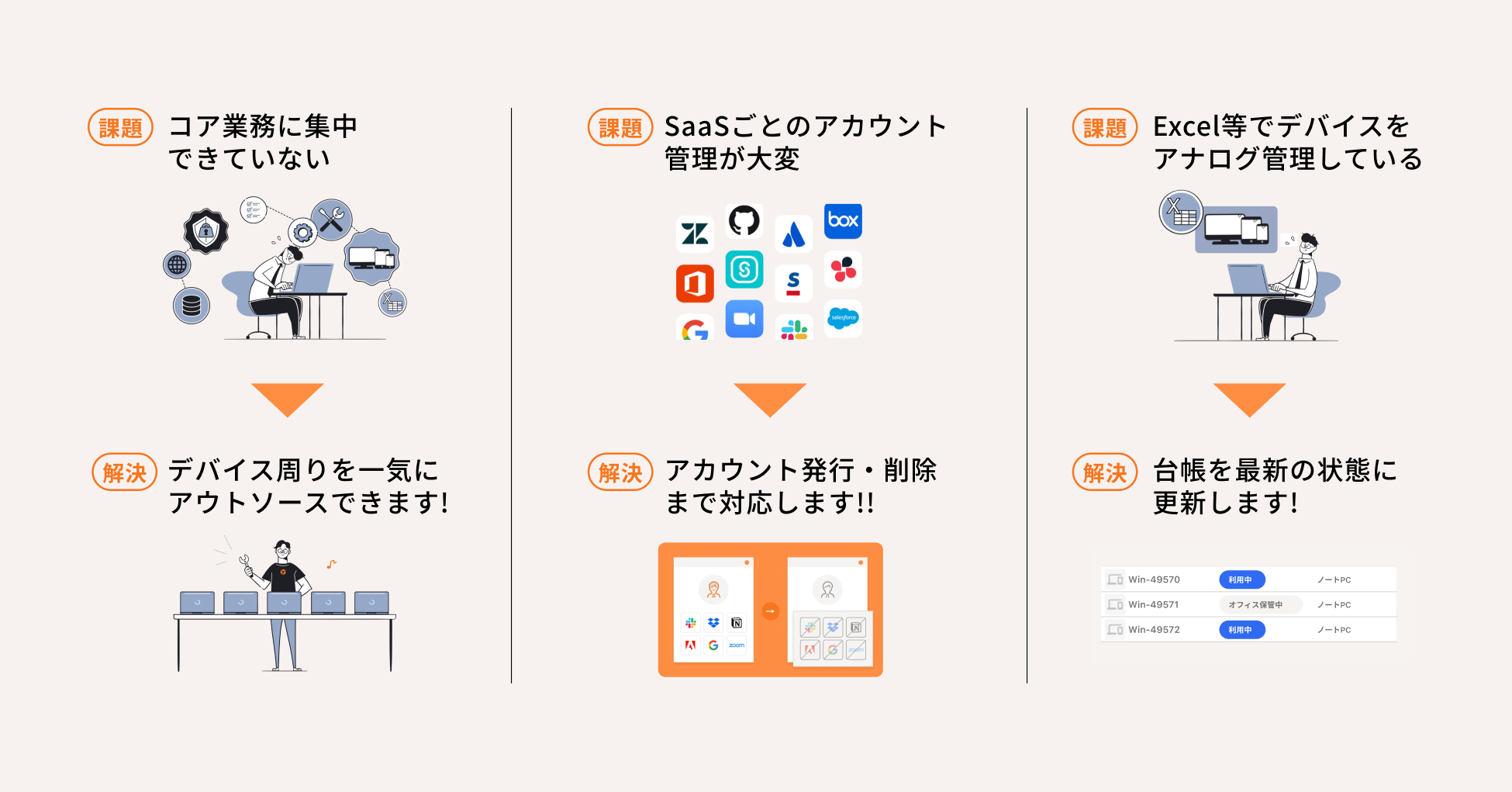 台帳管理やキッティングなどのデバイス業務だけではなく、アカウント発行、削除などSaaSについて発生する様々な管理業務を全て対応します。