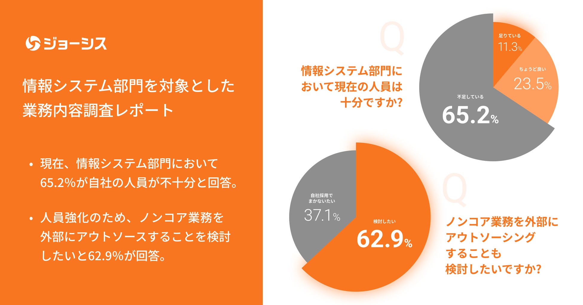 2023年5月実施の情報システム部門を対象としたジョーシスの調査では、現在65.2%が自社部門の人員が不十分と回答しています。また、「人員強化にあたり、ノンコア業務については外部にアウトソーシングすることも検討したいですか」という質問に対し、アウトソーシングを検討したいという回答は62.9%と自社採用でまかないたいの37.1%に比べ大多数であることがわかりました。(⋆1)