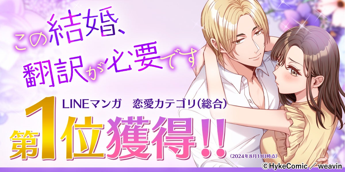 株式会社HykeComic(本社:東京都品川区、代表取締役:香田哲朗、株式会社アカツキの100%子会社)は、株式会社NTTドコモと共同制作を行う、『この結婚、翻訳が必要です』の縦読みフルカラー漫画がLINEマンガで配信を開始し恋愛カテゴリ(総合) 第1位(2024年8月11日時点)を獲得いたしました。