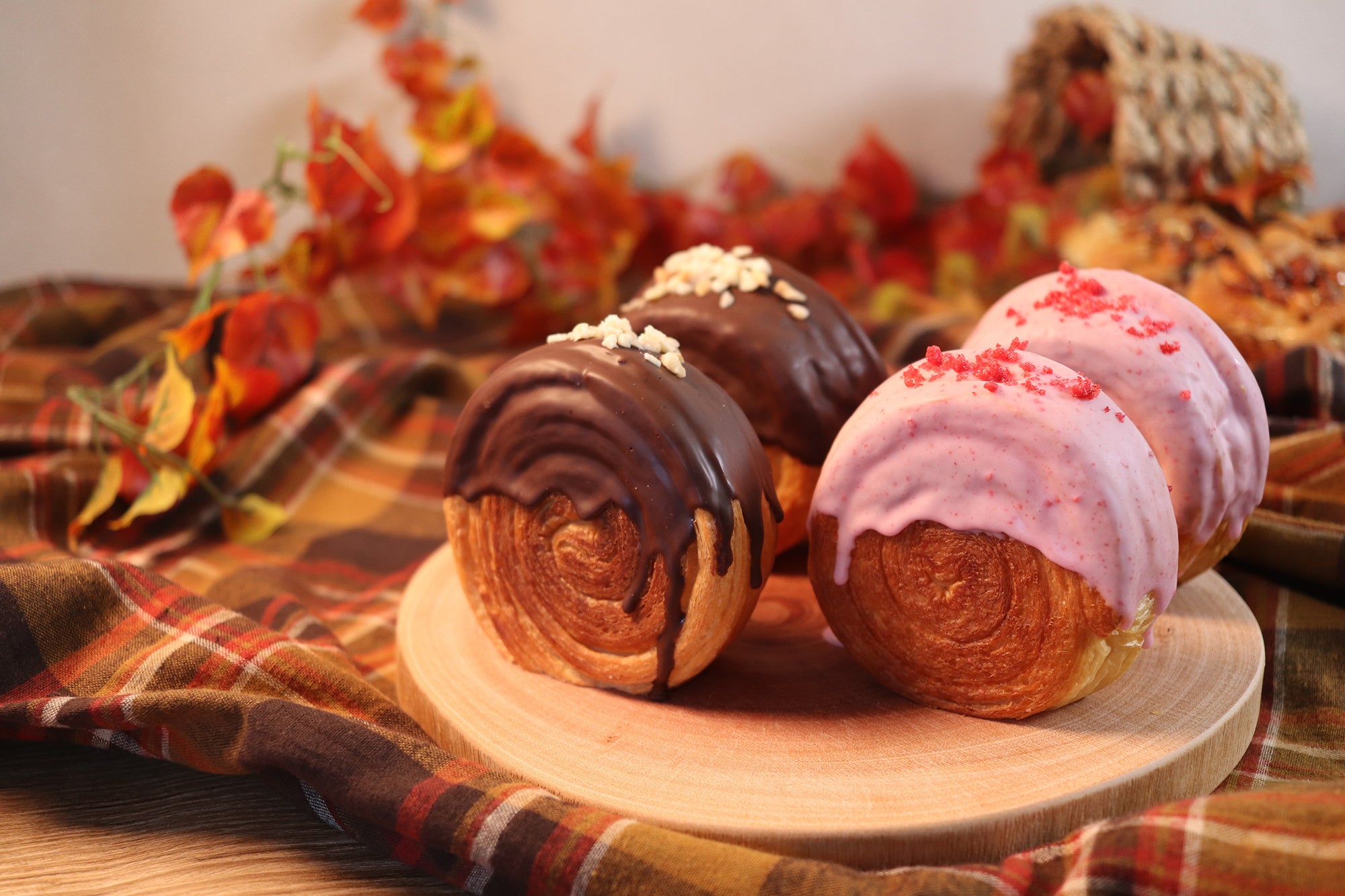 商品特徴:パリパリ食感のデニッシュ生地にチョコクリームやジャムを詰めた、切り株のようなクロワッサン!冬支度で忙しいくまさんも切り株でひと休み。