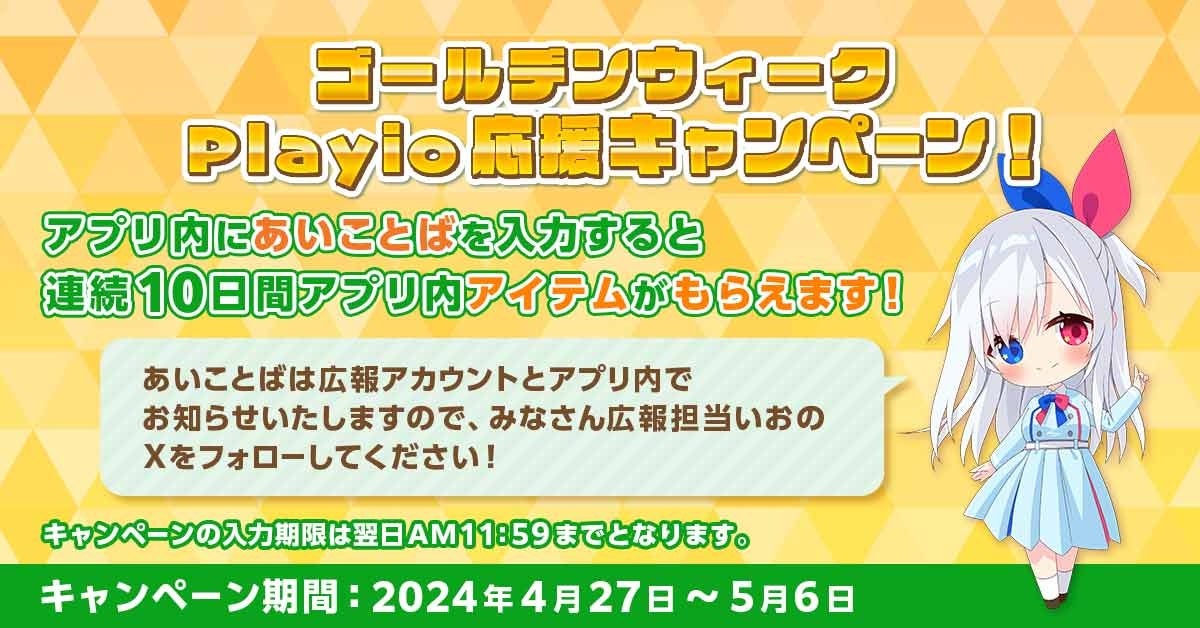 ゴールデンウィーク中は、Playio公式X(旧Twitter)@Playio_ioにて、2024年4月27日(土)より10日間連続で、アイテムプレゼントキャンペーンを実施いたします。