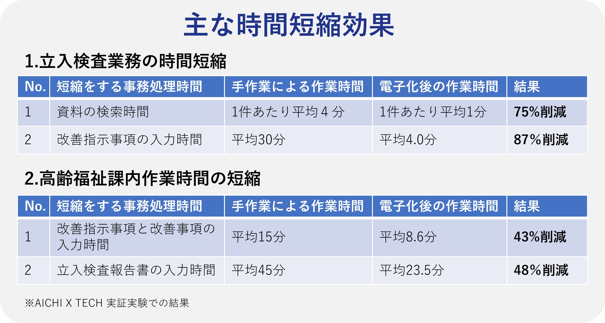 ・特に立入検査時の改善指示事項の入力時間は、50%の削減目標に対して87%の削減を実現