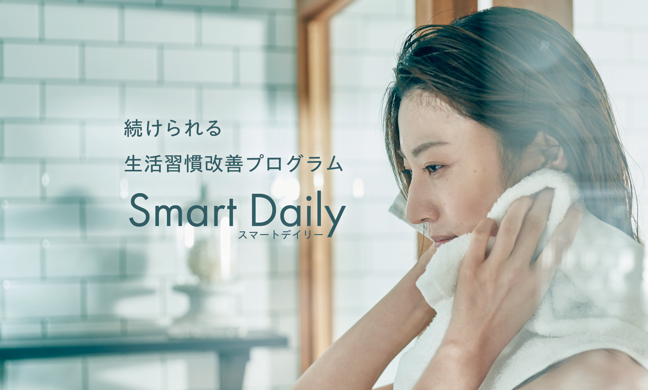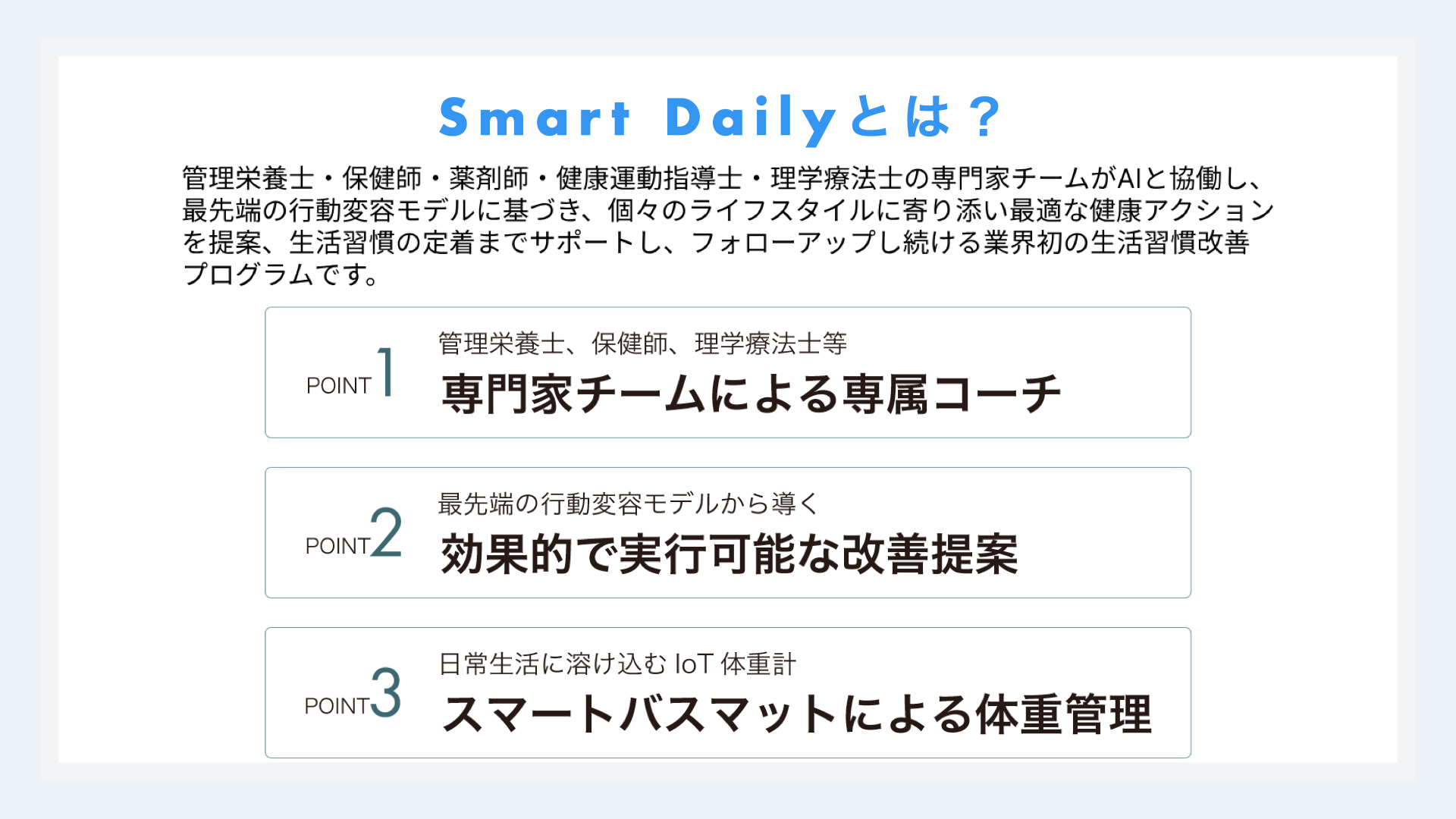 「Smart Daily」は、管理栄養士・保健師・薬剤師・健康運動指導士・理学療法士等の専門家チームがAIと協働し、最先端の行動変容モデルに基づき、個々のライフスタイルに寄り添い最適な健康アクションを提案、生活習慣の定着までサポートし、フォローアップし続ける日本唯一の生活習慣改善プログラムです。