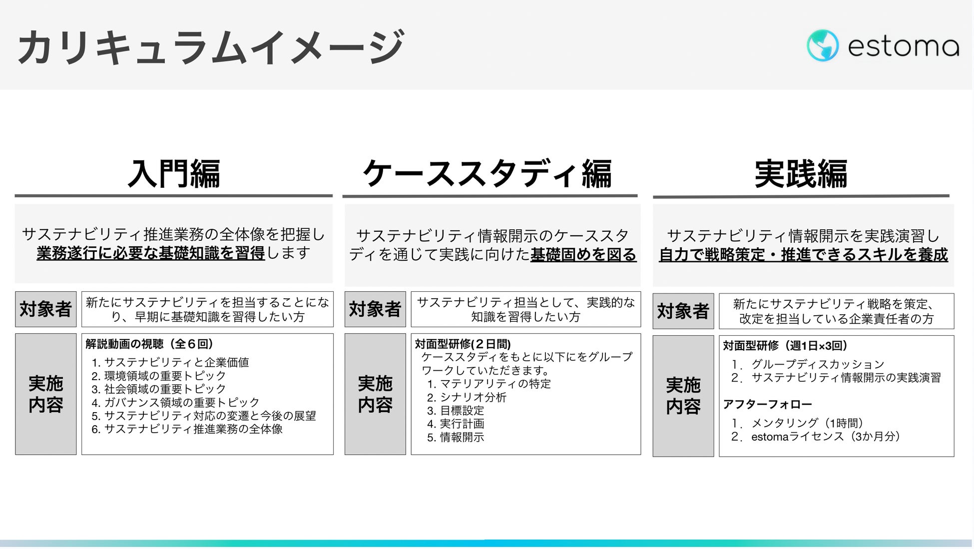 世界初のESG情報統合管理クラウドを運営する「estoma」(※1)は、サステナビリティ人材を育成する研修プログラムをリリースしました。サステナビリティ戦略を自力で策定・推進できる企業担当者を短期間で養成し、社内でのサステナビリティ推進の人材を育成します。