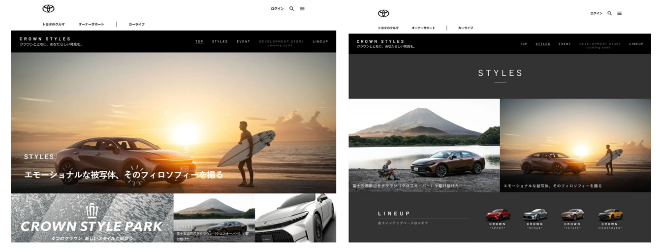 クラウンのあるライフスタイルを発信するメディア「CROWN STYLES」をクラウン公式サイト内に9月より開設しました。今後、クラウンの持つ価値観に共感いただいた人、クラウンオーナーの声、クラウンと共鳴するブランドの開発者同士の対談、開発ストーリーなど、様々な視点でクラウン体験の声やブランドストーリーを発信してまいります。 ▷特設サイト https://toyota.jp/info/crown_brand/