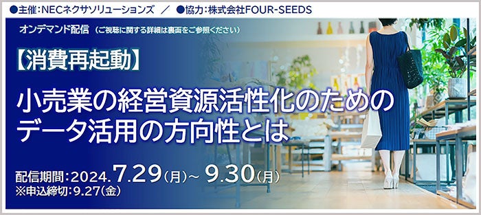NECネクサソリューションズは、7月25日に開催しました「【消費再起動】小売業の経営資源活性化のためのデータ活用の方向性とは」セミナーを好評につき、9月30日(月)20:00までオンデマンド配信します。お申し込みは9月27日(金)まで受け付けています。