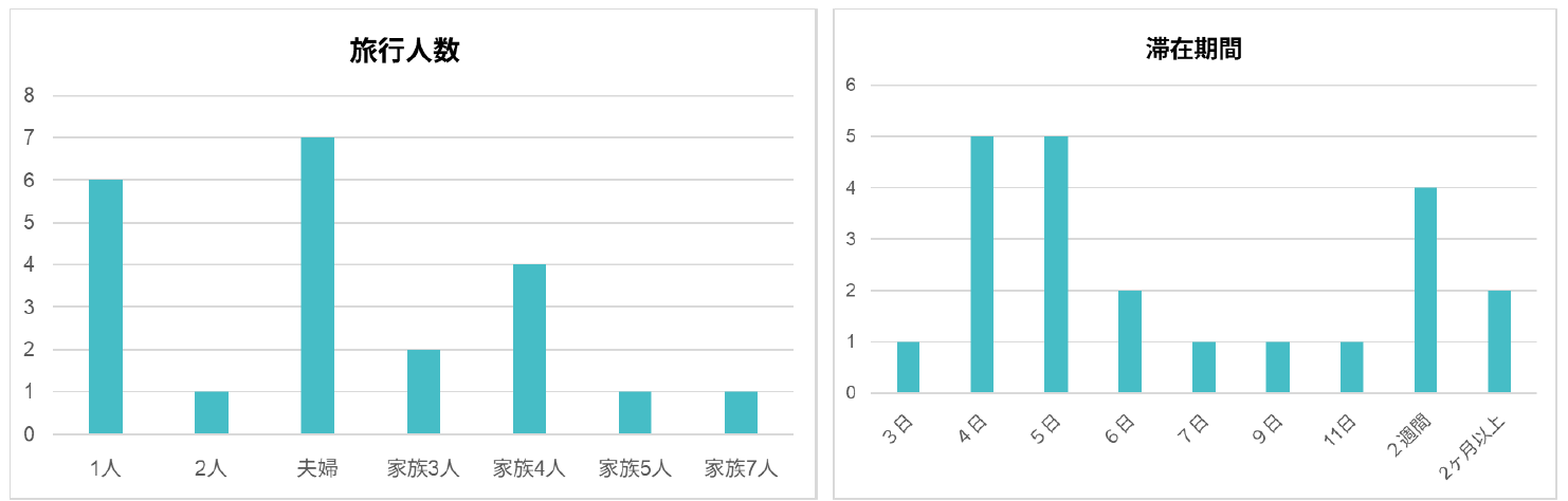 今回の旅のテーマ(目的)を訪ねたところ、家族で楽しむ(ドイツ/家族5人)、子供の体験(日本/母親と小学生2人)、家族とリラックス(シドニー/父母と小学生2人)と家族との時間を大切にする傾向がうかがえました。