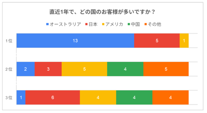 観光業に携わる地元企業を対象に「直近1年でどの国からのお客様が多いですか?」1位~3位までをたずねたところ、回答のあった19社のうち1位は「オーストラリア」13社、2位は「日本」5社と、「オーストラリア」に次いで「日本」との回答が多くあり、次いで「アメリカ」の順で回答がありました。今回の調査で「日本」が重要なマーケットであることを確信しました。