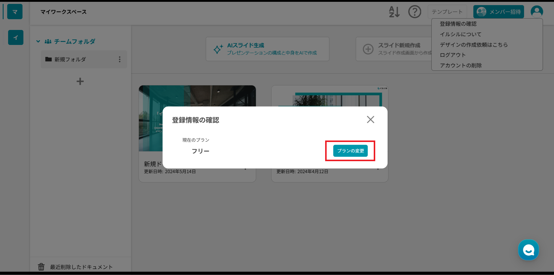 1. 画像右端のアカウントボタンから「登録情報の確認」→「プランの変更」をクリックします。