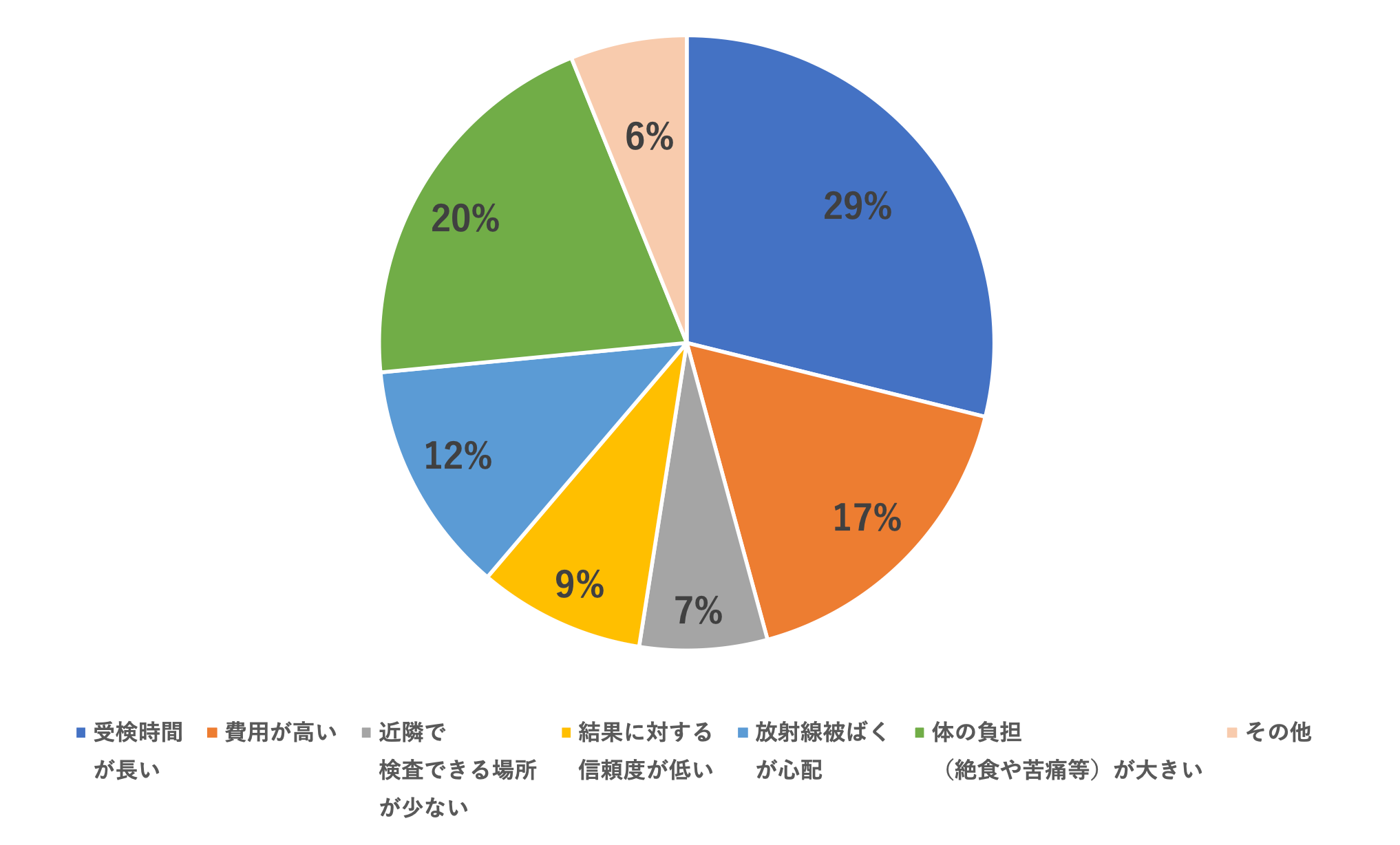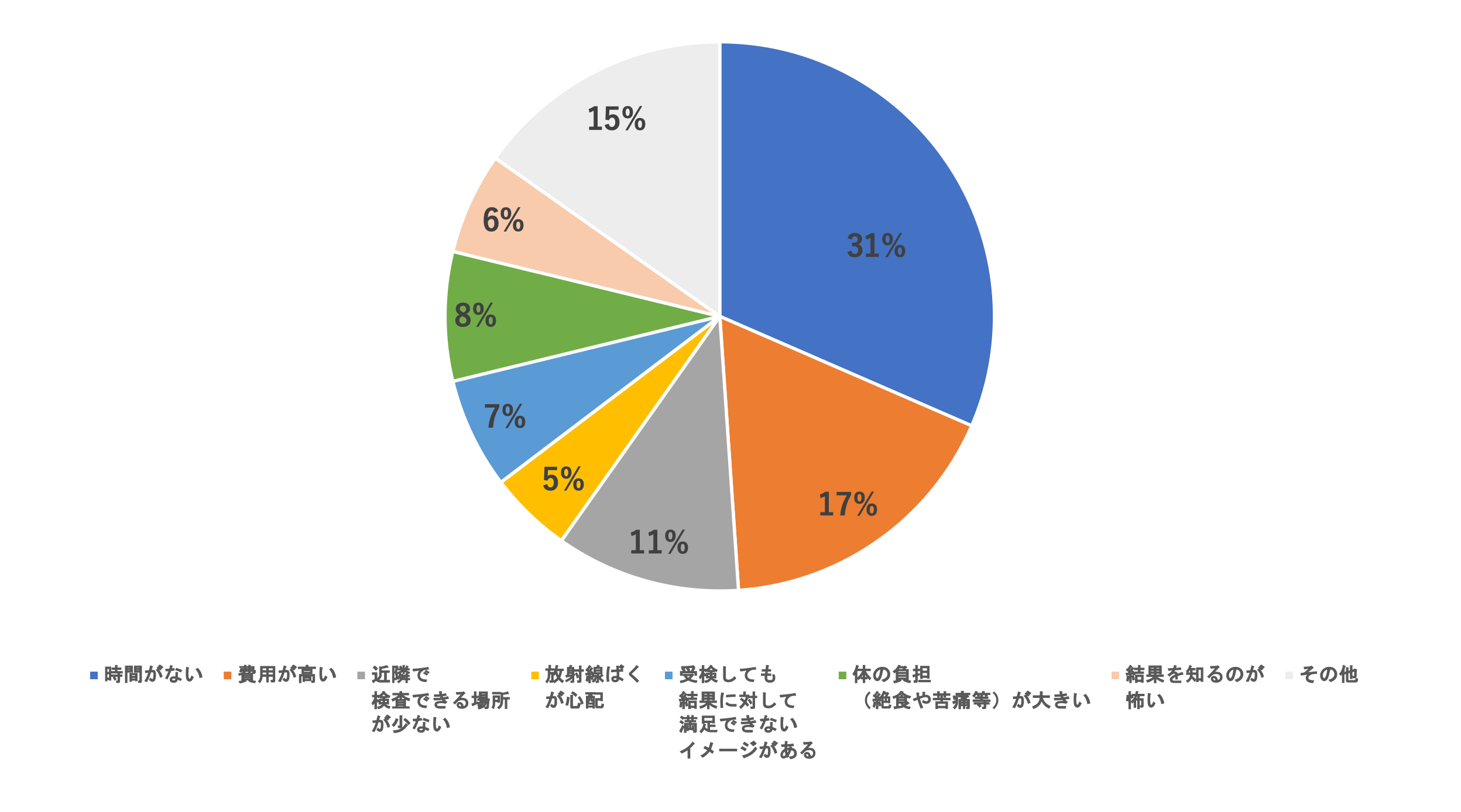 一方、これまでがん検査を受検されていない方も、受検していない要因として、「時間がない」、「費用が高い」という回答が多く、これまで他のがん検査を受検されている方・されていない方、共に、従来のがん検査に要する “時間”、“費用” が課題になっていると推測。