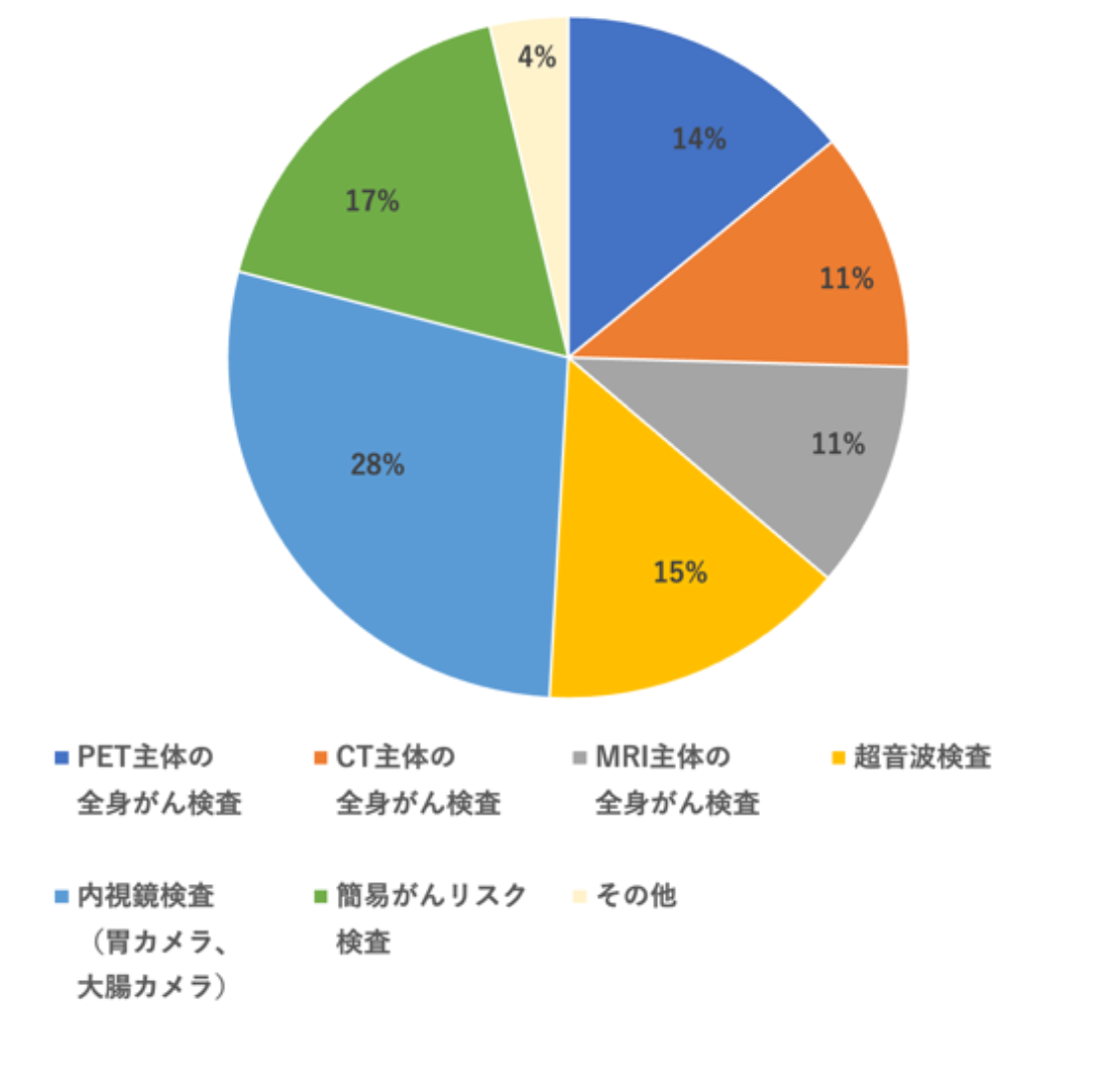 一番多く受検されている検査は、「内視鏡検査(胃カメラ、大腸カメラ)」で、次いで「簡易がんリスク検査」、「PET主体の全身がん検査」が多い。