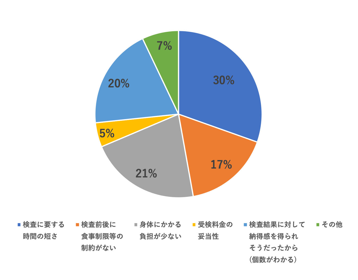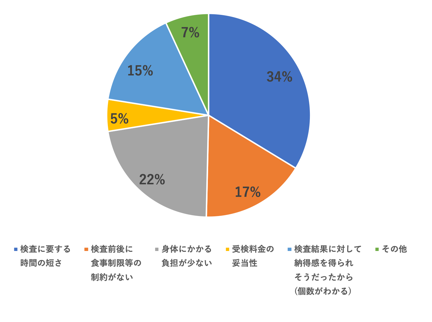 TOPIC②:『マイクロCTC検査』を受検した要因として、「検査に要する時間の短さ」という回答が約30%と最も多く、次いで「身体にかかる負担が少ない」という回答が約20%と多い。