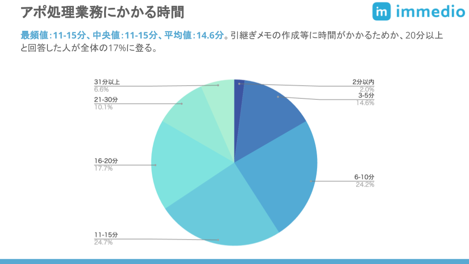 アポ処理業務でも実施率45%を超える項目が6つあり、同様に負荷が高い業務と分かった。アポ処理にかかる時間は平均15分で、20分以上かけている人も多い。業務の課題としては、人ごとの質のばらつきや、時間がかかることがあげられた。