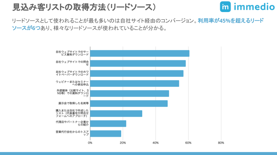 見込み客リストの取得方法で最も多いのは、自社ウェブサイトでの資料ダウンロード