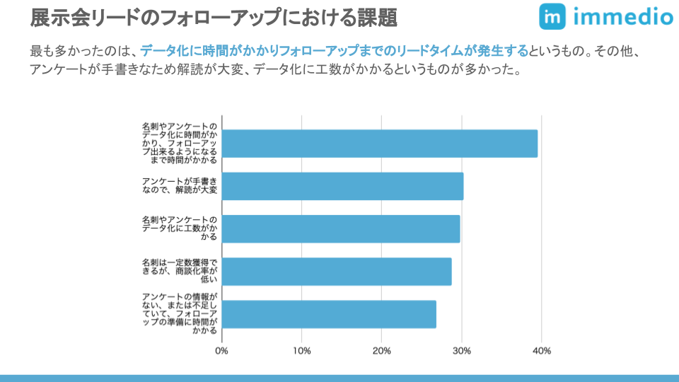展示会リードの課題で最も多いのは、データ化に時間がかかりフォローアップまでのリードタイムが発生する