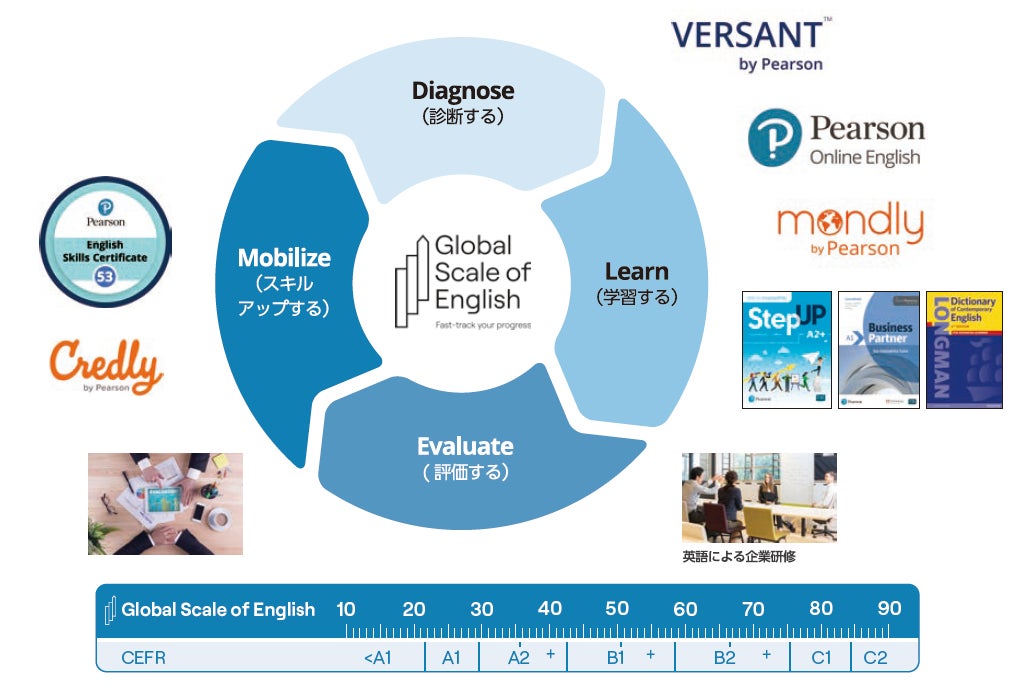 学習のサイクルを「診断」「学習」「評価」「スキルアップ」までワンストップで支援する教育サービス会社として、ピアソン・ジャパンではビジネス英語の研修・学習支援からグローバルリーダーの育成まで、グローバル人材の育成に関するトータルソリューションを提供しています。