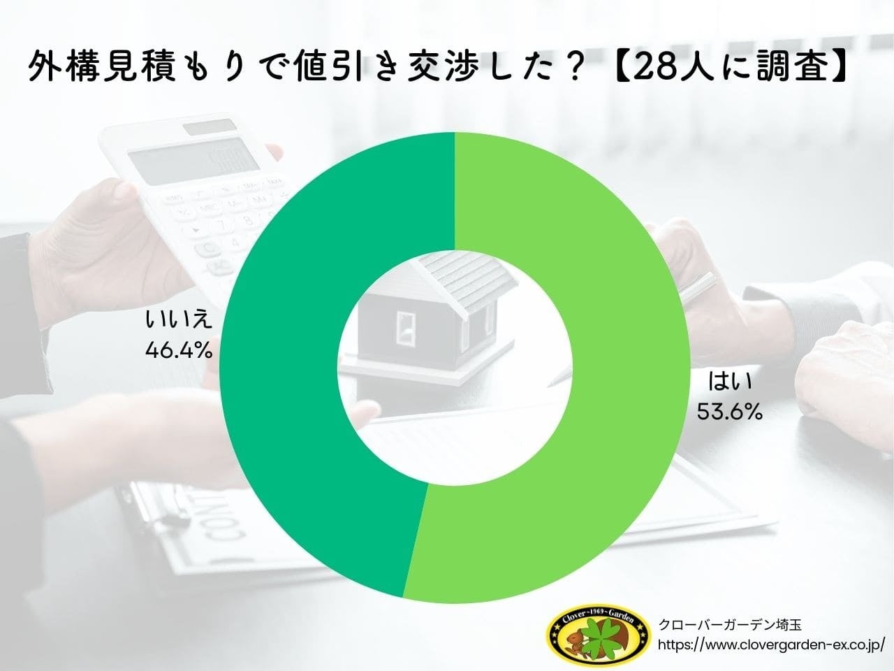 アンケート結果によると、15人(53.6%)が外構業者との見積もり段階で値引き交渉を行ったと回答しています。これに対し、13人(46.4%)は値引き交渉を行わなかったと答えています。このデータから、外構工事における値引き交渉は決して珍しい行為ではなく、半数以上の人々がコスト削減のために積極的に交渉に臨んでいることがわかります。