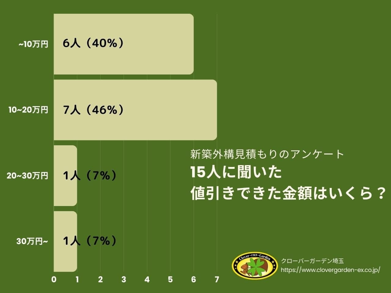 調査結果によると、最も多くの人が実現した値引きの金額は「10万円から20万円」で、参加者の約46%にあたる7人がこの範囲での値引きに成功しています。これは、外構工事における値引き交渉で最も一般的な成果を示しており、多くの消費者にとって参考になるデータです。