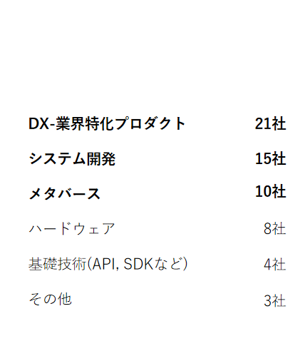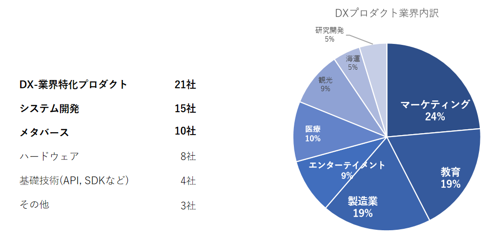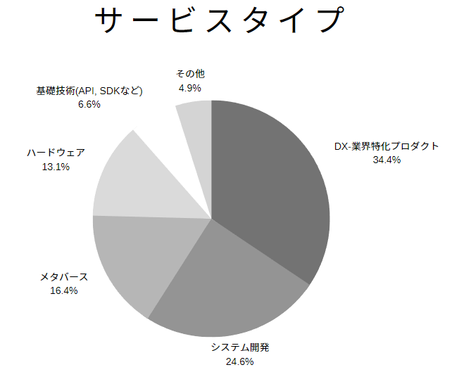 弊社は以下のようにサービスタイプを区分しており、DX-業界特化プロダクト関連サービスが約半数を占めています。