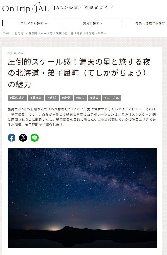 一般社団法人 摩周湖観光協会(会長:渡辺 隆幸)は日本航空株式会社が運営するWebマガジン「On Trip JAL」で弟子屈町 冬の魅力を発信した。