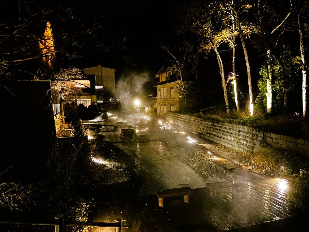 川湯温泉街には温泉が流れる川「温泉川」があり秋に完成した「川湯 岩盤テラス」では硫黄山から流れつく温泉の仕組みなどの解説看板や木道が用意されている。早朝には温泉から昇る水蒸気が霧氷