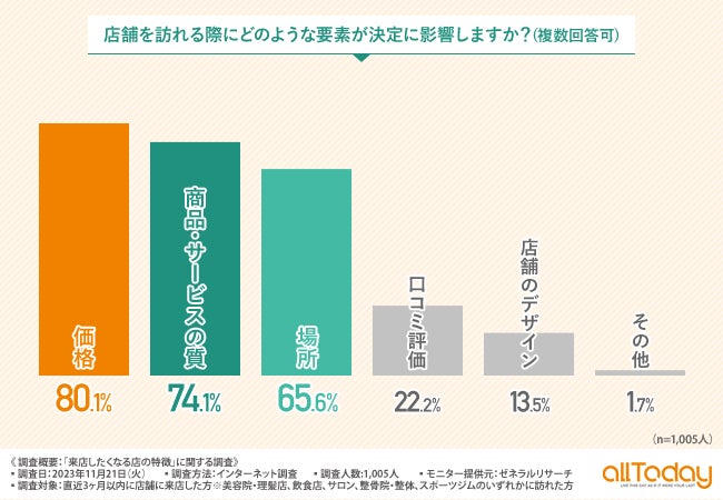 【オールトゥデイ|調査レポート】8割以上の方が店舗に訪れるか決める際に「価格」の影響を受けると回答。