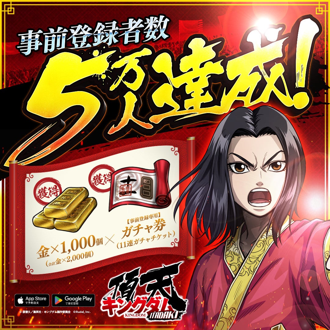 『キングダム 頂天』の事前登録者が5万人を突破いたしましたので、リリース後に金2,000個と【事前登録専用】ガチャ券(11連ガチャチケット)1枚を皆様にプレゼントいたします。誠にありがとうございます!