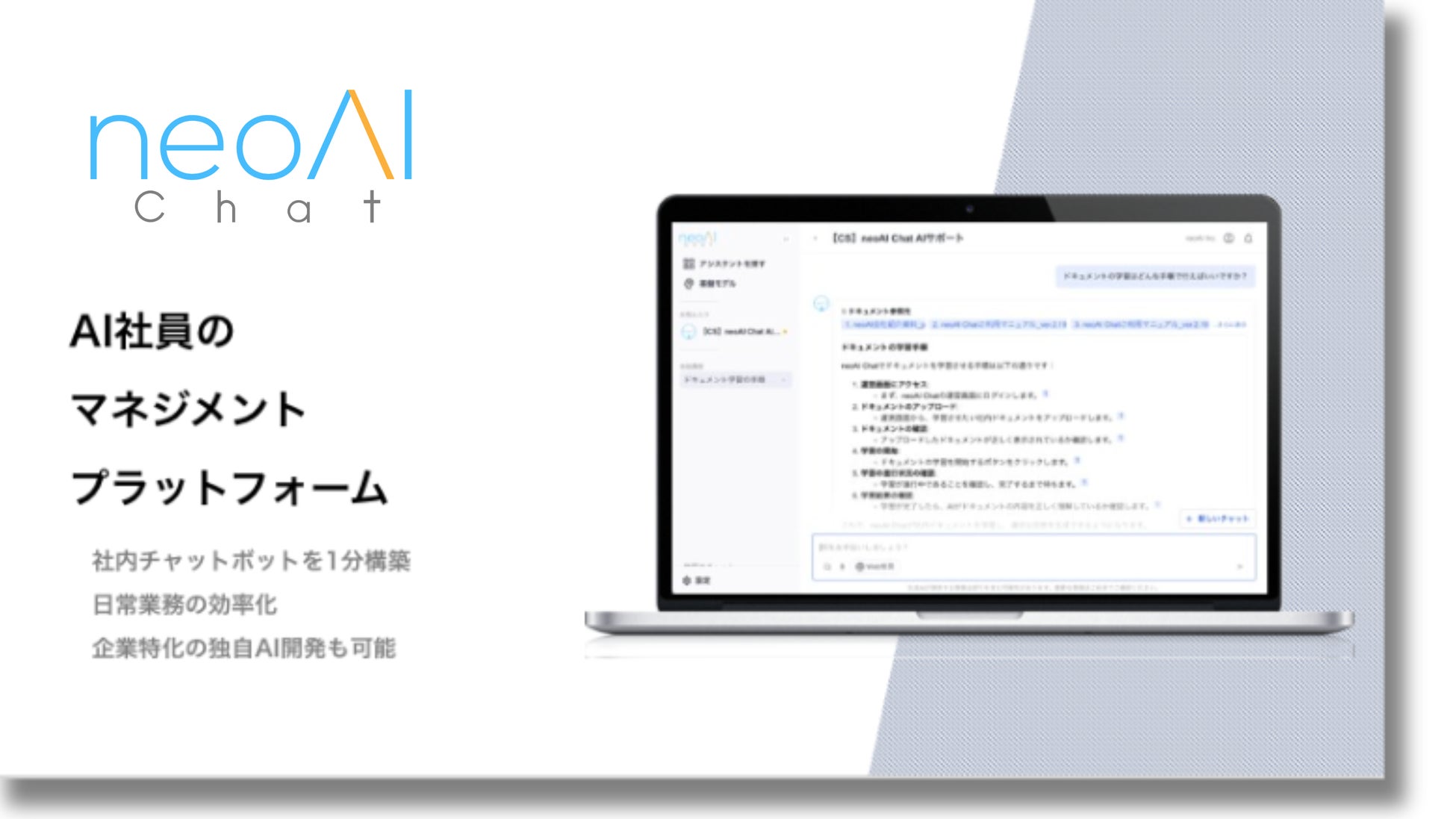 neoAI Chatは、汎用大規模言語モデルによるチャット機能と、業務特化型AIアシスタントの設計・運用をワンプラットフォームで提供する法人向けクラウドサービスです。