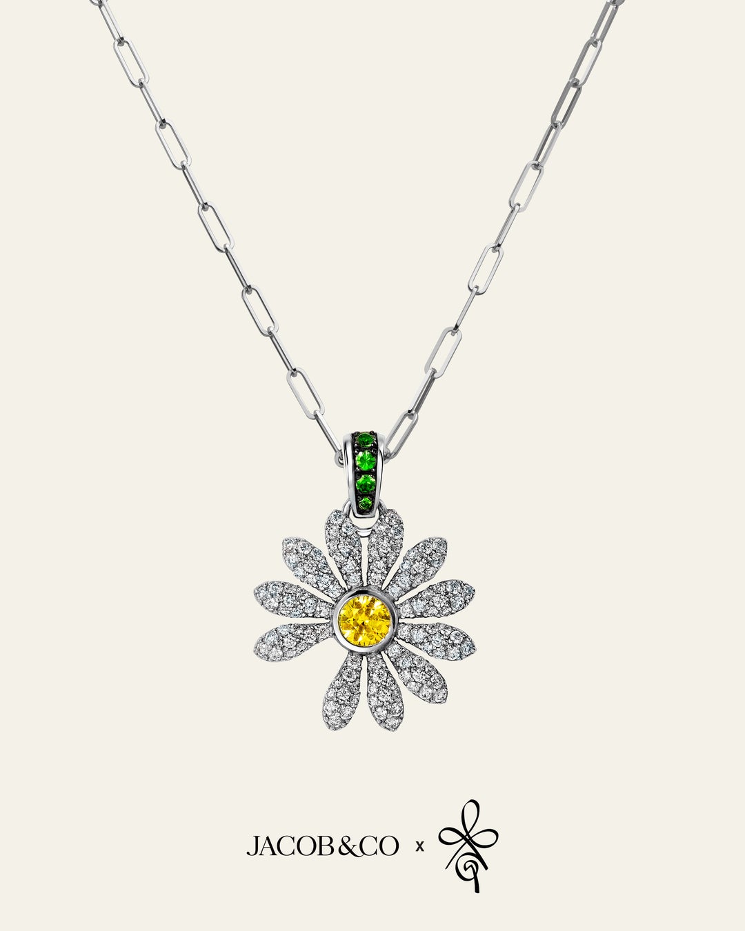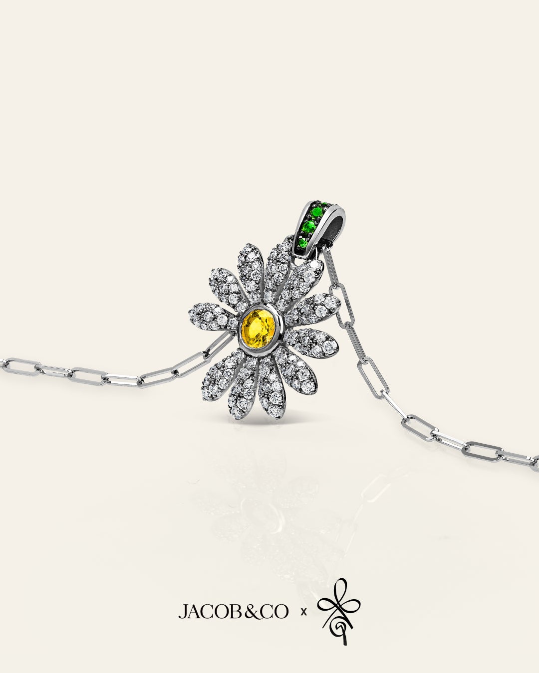 本商品は、「G-DRAGON」のアイコンであるデイジーを、ジェイコブ&コーらしいラグジュアリーなジュエリーへと昇華させた唯一無二のコレクション。18Kホワイトゴールドにファンシービビッドイエローダイヤモンドを中心に配し、ホワイトダイヤモンドで華やかに彩った、スタイルとコレクタブル性を兼ね備えた逸品です。
