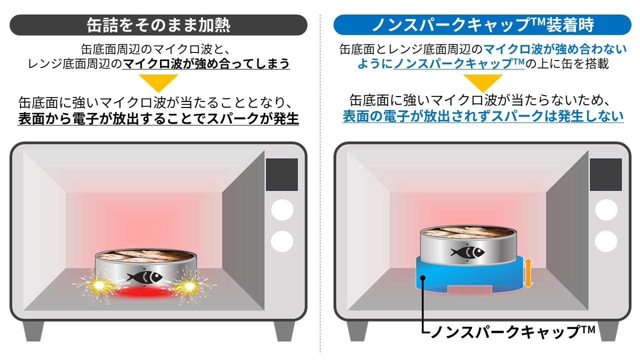 「ノンスパークキャップ™」は、缶詰の底部に取り付ける専用アタッチメントで、レンジ庫内底面との間隔を適切に保つ構造を採用しています。これにより、電子レンジ加熱時に懸念されていたスパークの発生を抑えることが可能となり、手軽に缶詰を温められる新しい調理体験を実現しました。